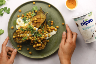 Servir les aubergines avec une belle cuillère d’Alpro coco, les pois chiches grillés, un peu de fleur de sel et de la coriandre fraîche