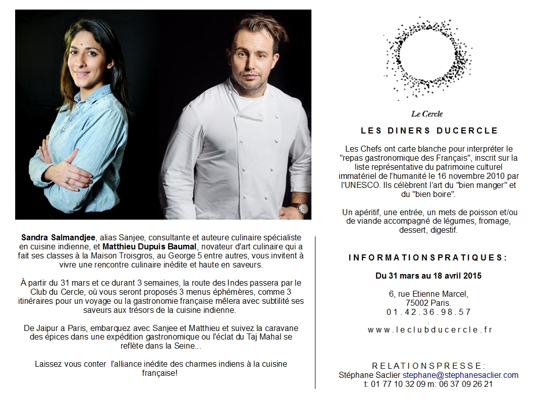 Sandra Salmandjee, alias Sanjee, consultante et auteure culinaire spécialiste en cuisine indienne, et Matthieu Dupuis Baumal, novateur d’art culinaire qui a fait ses classes à la Maison Troisgros, au George 5 entre autres, vous invitent à vivre une rencontre culinaire inédite et haute en saveurs.
