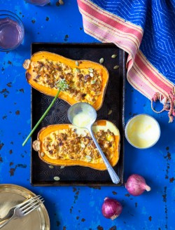 Courge ou butternut farci au paneer et aux amandes, grenade et crème au safran