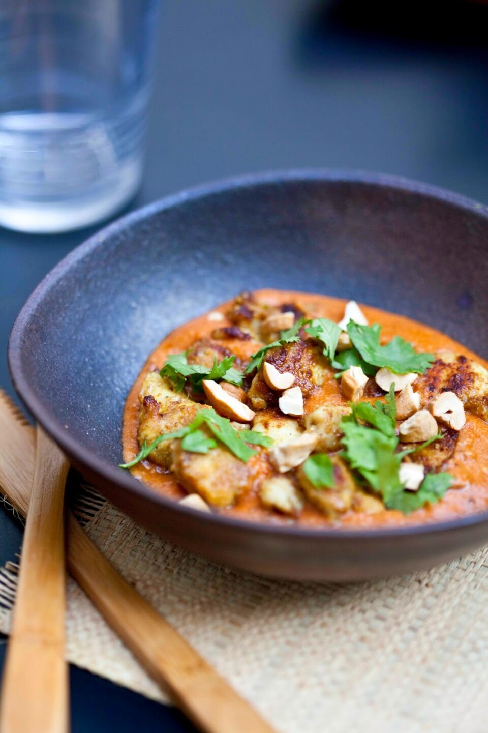 Ingrédients : 250gr (soit une barquette) de filet de lapin Loeul et Piriot, 20 cl de coulis de tomates, 20cl de lait de coco, 10 gr d’amandes en poudre, 1 oignon haché, 2 gousses d’ail pressées, 1 petit morceau de gingembre frais, un peu de curcuma, de sumac et de curry en poudre + noix de cajou et coriandre fraiche pour la déco.