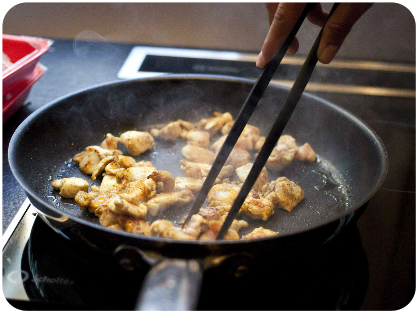 Laisser bouillonner à découvert à feu doux pendant 10 min, le temps de saisir les morceaux de lapin dans un poêle légèrement huilée. Ajouter les Morceaux de lapin dorés à la sauce et servez aussitôt avec des noix de cajou concassés et de la coriandre fraîche.