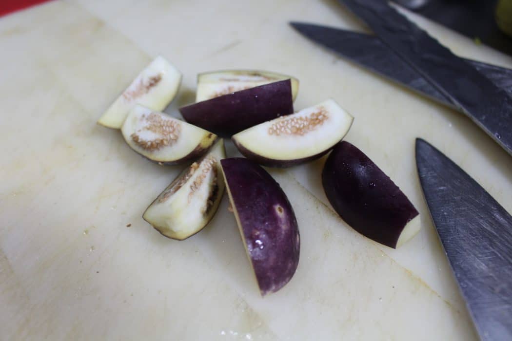 Ajouter ensuite les aubergines coupée en 4 et faire sauter 5 minutes, puis ajouter 1/2 verre d’eau et laisser cuire jusqu’à évaporation.