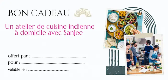 à la uneEvènementsRecette de fêteIdée cadeau de Noël ★ by sandra sanjeenovembre 5, 2025novembre 19, 2025061 OFFREZ OU OFFREZ-VOUS UN COURS DE CUISINE INDIENNE 250€ POUR UN COURS POUR 4 PERSONNES / PARIS * Offre valable pour toute demande effectuée avant le 25 Décembre, le bon cadeau est valable 1 an.