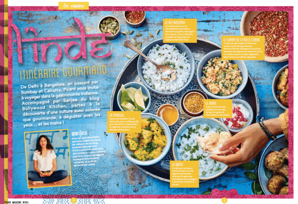 C’est la gastronomie indienne qui s’ouvre à vous aujourd’hui ! Accompagné par Sandra Salmandjee, alias Sanjee, du blog Bollywood Kitchen, Picard vous invite à découvrir des recettes hautes en couleurs et en saveurs et à laisser de côté vos couverts pour déguster avec les mains ! Car oui, en Inde, la cuisine est aussi belle à manger, qu’à regarder ou à toucher ; une multiplication des sens qui donne un goût particulier à cette expérience exotique. Bon voyage !