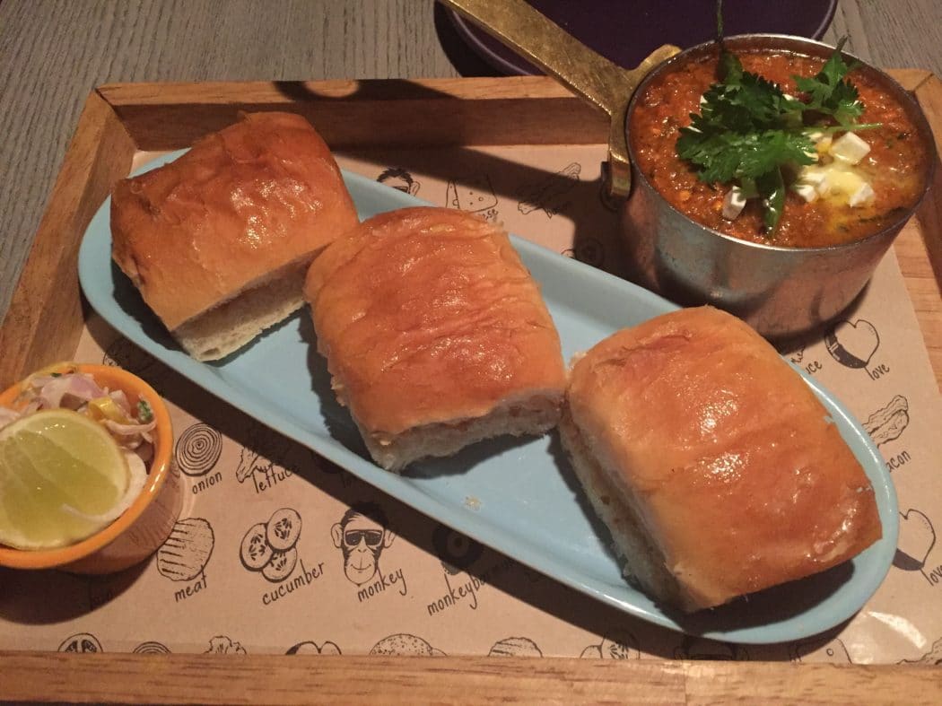 Paneer pav bhaji : pain brioché grillé et beurré, sauce tomates épicée et paneer.